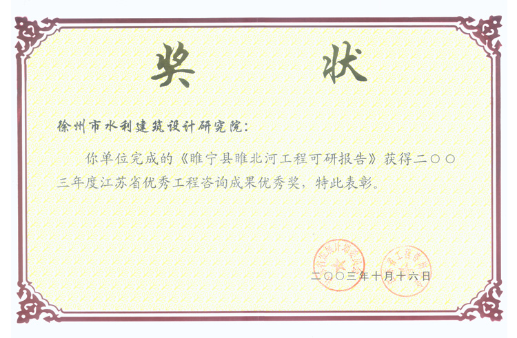 《睢北河工程可研報告》咨詢優(yōu)秀獎(2003)
